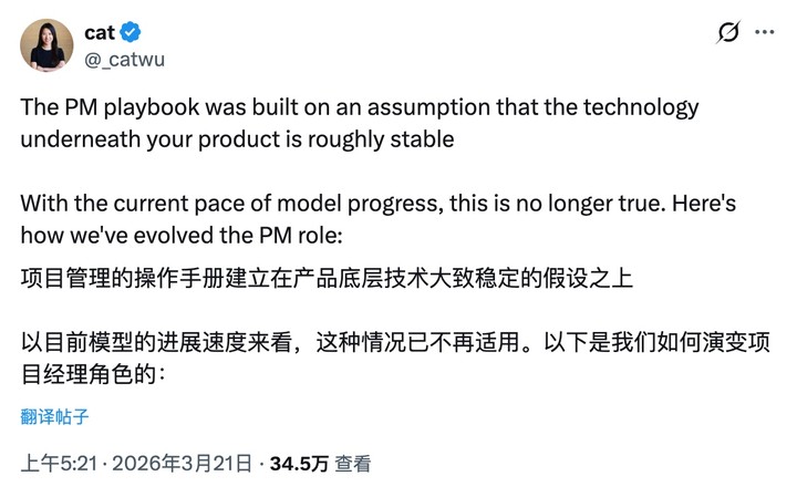 Wu 指出,传统 PM 工作方法建立在「底层技术相对稳定」的假设之上,但在当前模型能力持续跃迁的环境中,这一前提已不复存在。她表示,随着模型更新频率与能力边界不断变化,产品管理流程也必须同步调整。