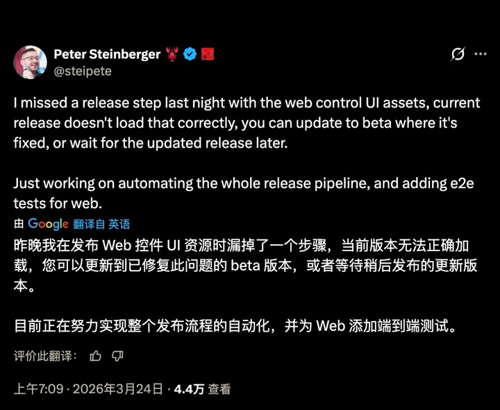 「龙虾之父」Peter Steinberger 还发文提到,发布新版本时人为漏掉了一个处理「网页控制界面资源」的步骤。这导致用户下载的当前版本无法正确加载网页控制界面。