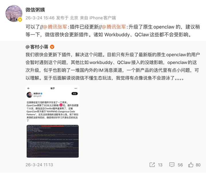 事件发酵后,微信员工「@客村小蒋」昨日在微博回应称「我们很快会更新下插件,解决这个问题」,并表示「openclaw 的这次升级,似乎也影响了一堆国内外的 IM 消息渠道,一个新产品的迭代里有点小问题,可以理解」。