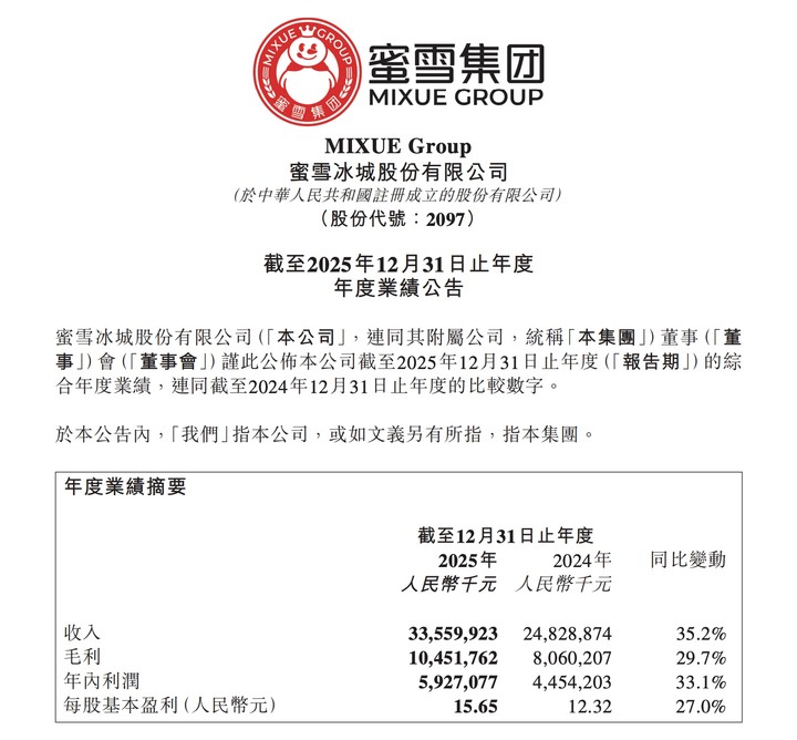 蜜雪集团于昨日午间发布 2025 年度业绩公告。总体来看: