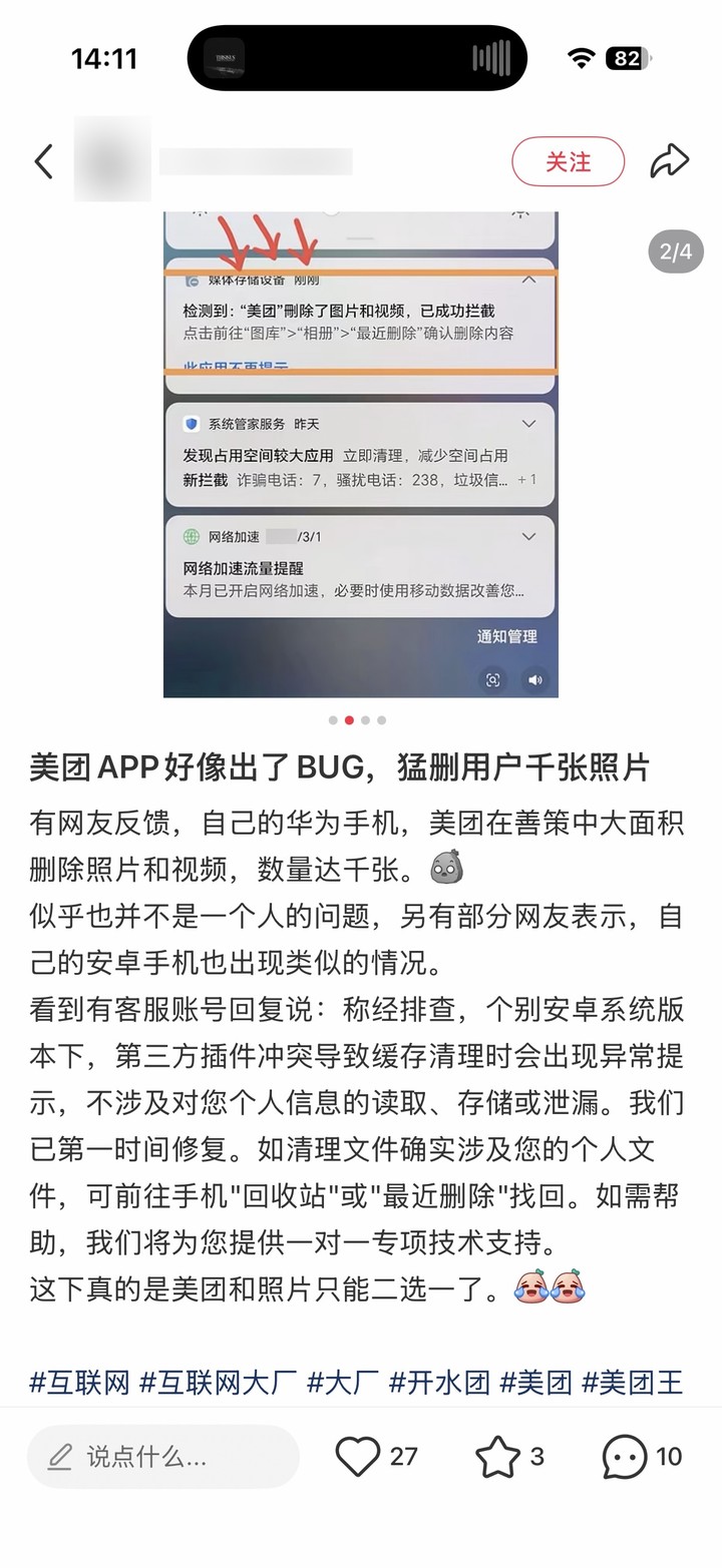 部分用户表示,在未执行任何操作的情况下,数百乃至数千张照片、视频被自动清空,系统拦截日志显示执行删除操作的应用为美团。该话题一度登上热搜,引发广泛讨论。